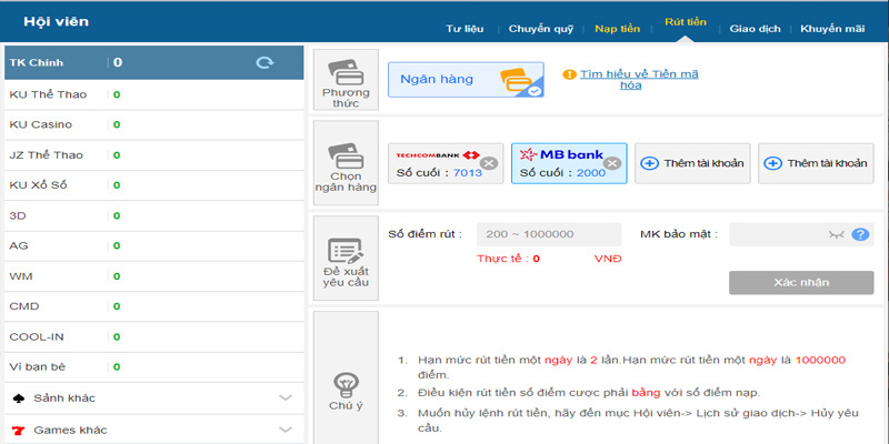 Đối với những người chơi muốn biết liệu TU Casino có rút tiền hay không, việc làm quen với quy trình rút tiền là vô cùng quan trọng. Dưới đây là các bước thao tác tiêu chuẩn trên nền tảng, giúp bạn dễ dàng quản lý tài chính và tận dụng những tỷ lệ cược tốt nhất: